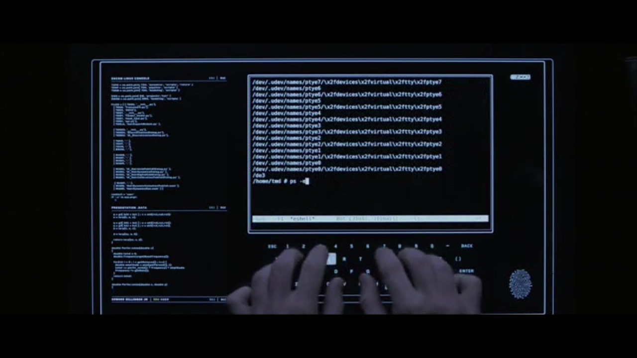 - A similar shot is that of peeking over the character’s shoulder and showing a screen reflecting the face of the hacker (e.g. WarGames, Assassins).