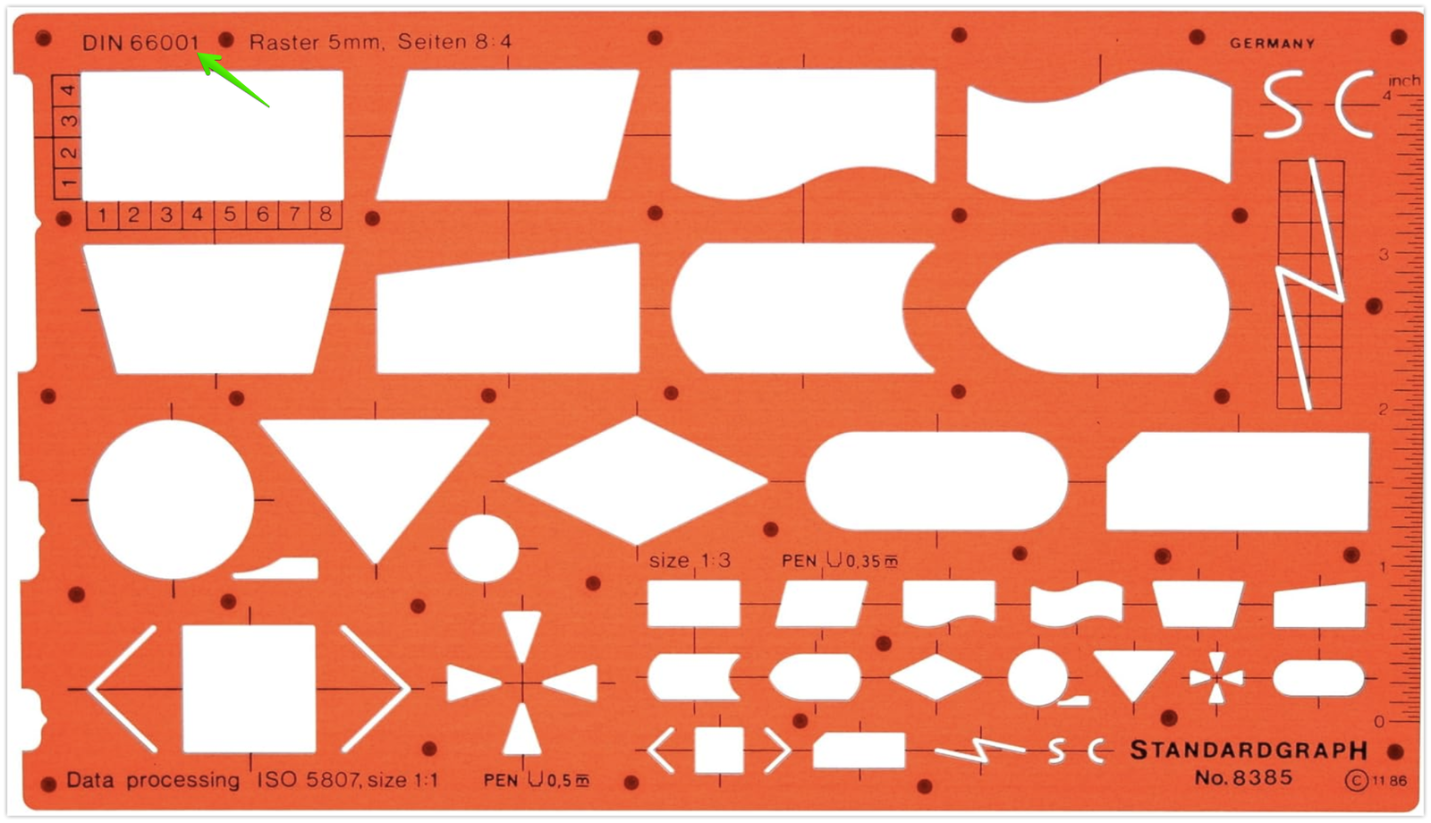 Mit der DIN 66001 wird übrigens diese Schablone (auf der Basis der ISO 5807, die Ihr ab 142 Euro erwerben könnt beim Beuth-Verlag) normiert, die Ihr vielleicht schon mal irgendwo bei den Zeichenmaterialien gesehen habt: